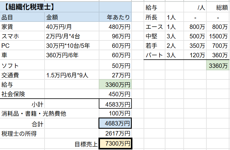 この場合は、年間コストが4683万円なので税理士の所得を加味して目標売上は7300万円としてみました。給与の内訳は右側に記載しています。