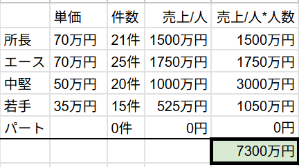 所長はマネージメント業務もあるので、少し売上高を下げました。パートは「入力補助者」のため、直接的な売上はない想定です。