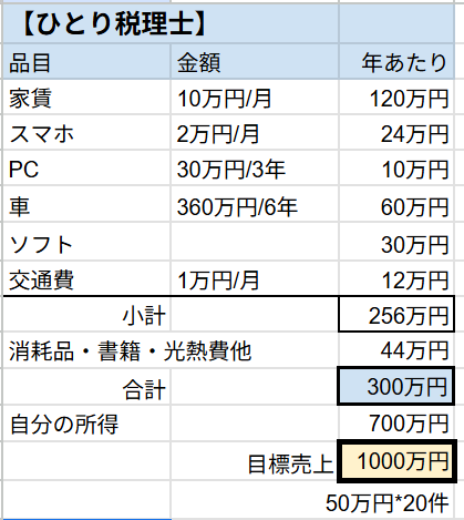 ザっとコストは年間300万円かかるとします。ここに自分の所得として700万円ほしいのであれば、目標売上は1000万円となります。